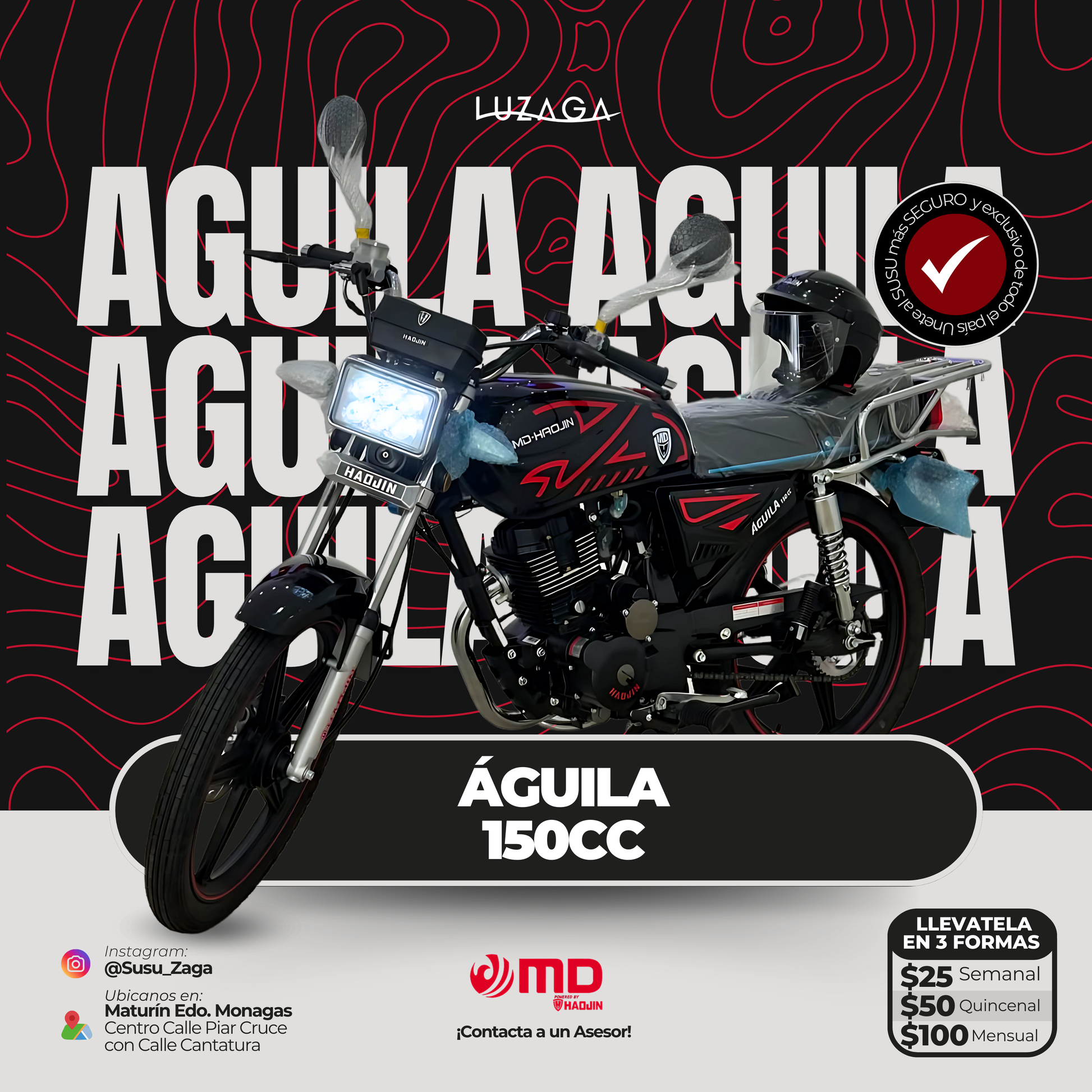 "Haojin Aguila 150cc es una moto de gran potencia y resistencia, ideal para viajes largos por carretera. Con un motor de 150cc, esta moto alcanza una velocidad máxima del 70%, lo que garantiza una experiencia de conducción emocionante y segura. Perfecta para aquellos que buscan un medio de transporte eficiente y confiable."